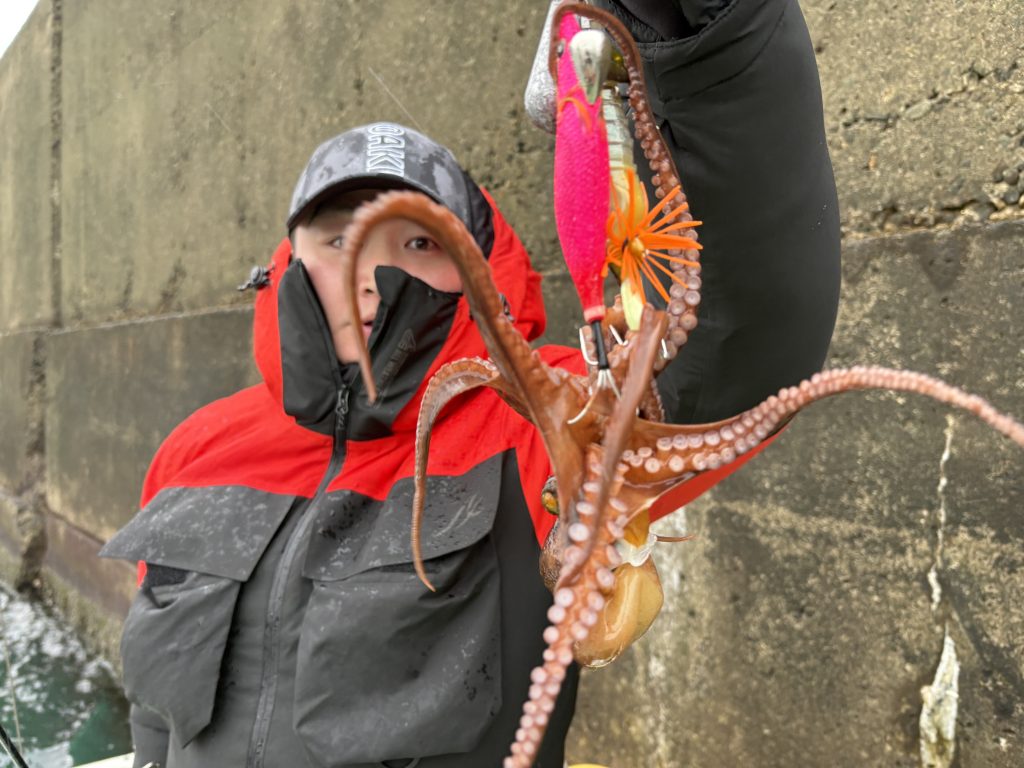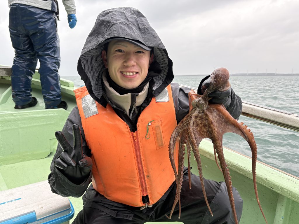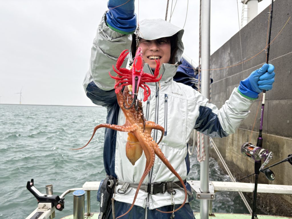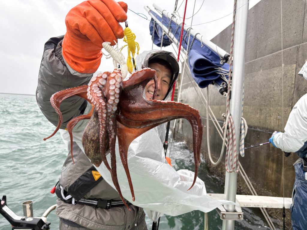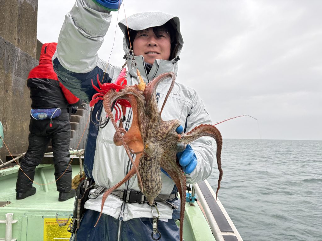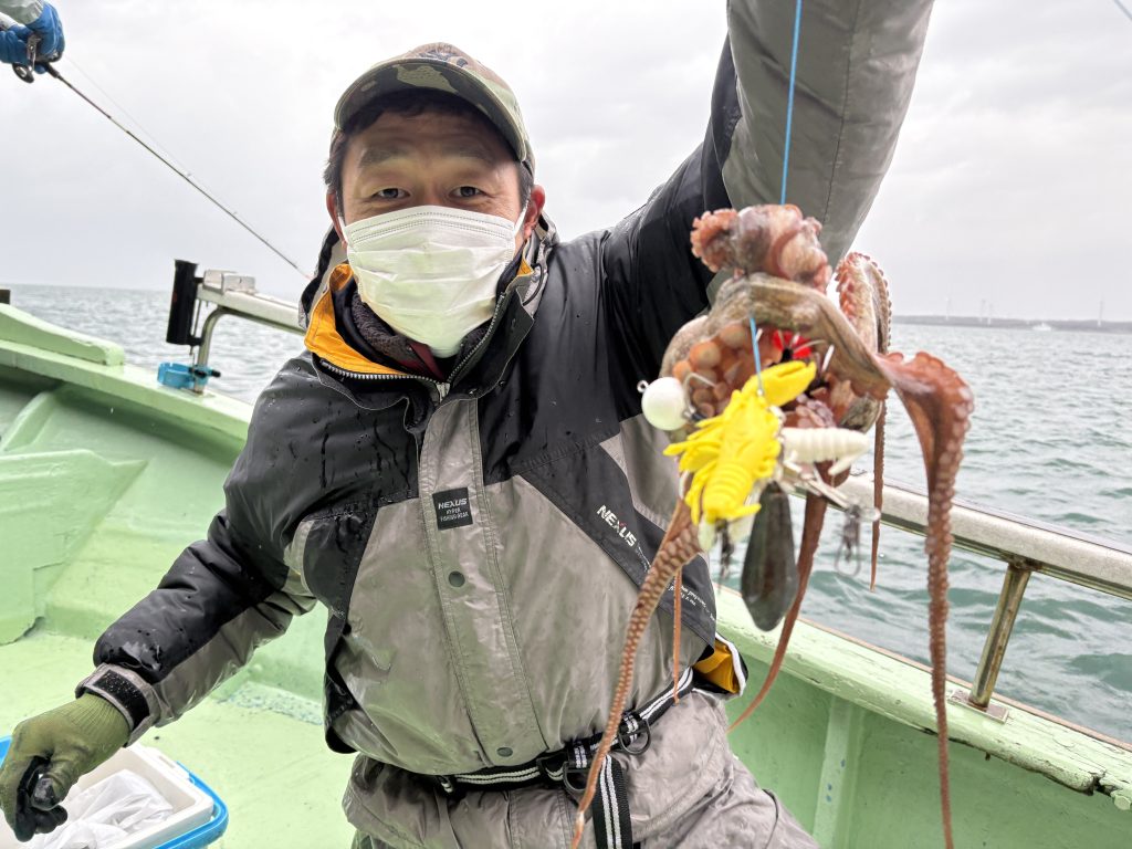 久々の出船は、近場⓶が海況不良でタコ釣りに変更。南寄りの風は雨混じりで気温以上に寒い環境。