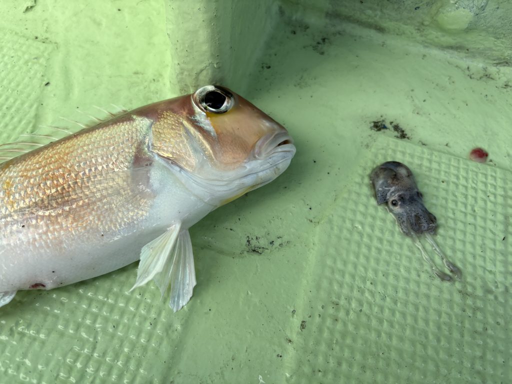 釣果は、どこも漁船の操業あとのようでアタリが少なく、漁礁や岩場周辺で実釣しましたが、いるはずの根魚のアタリが無く、明日以降の出船に影が差してる感じでした。ただ、この時期の甘鯛はイカも食べているのか口から出てきたのは小さなイカでした。